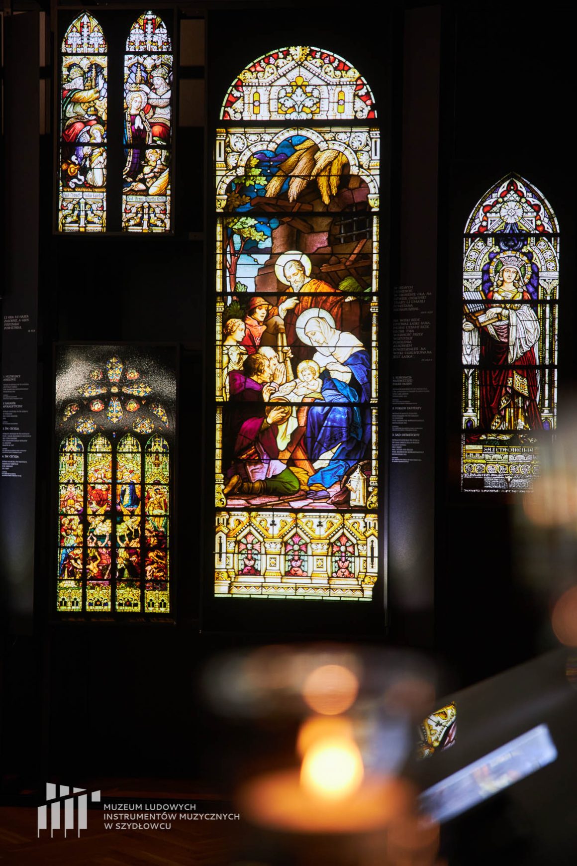 The exhibition features 60 stained glass windows, primarily from churches but also from secular buildings – two original stained glass panels on loan from the Nicolaus Copernicus Museum in Frombork and the Jagiellonian University Collegium Maius Museum in Krakow, as well as 58 digital photographs in the form of lightboxes. The oldest photographically reproduced works date from the 15th century, from the Corpus Christi Church in Krakow and the Dominican Museum in Krakow. The most numerous are those from the Renaissance period of stained glass art – from the early 20th century to the 1930s.
