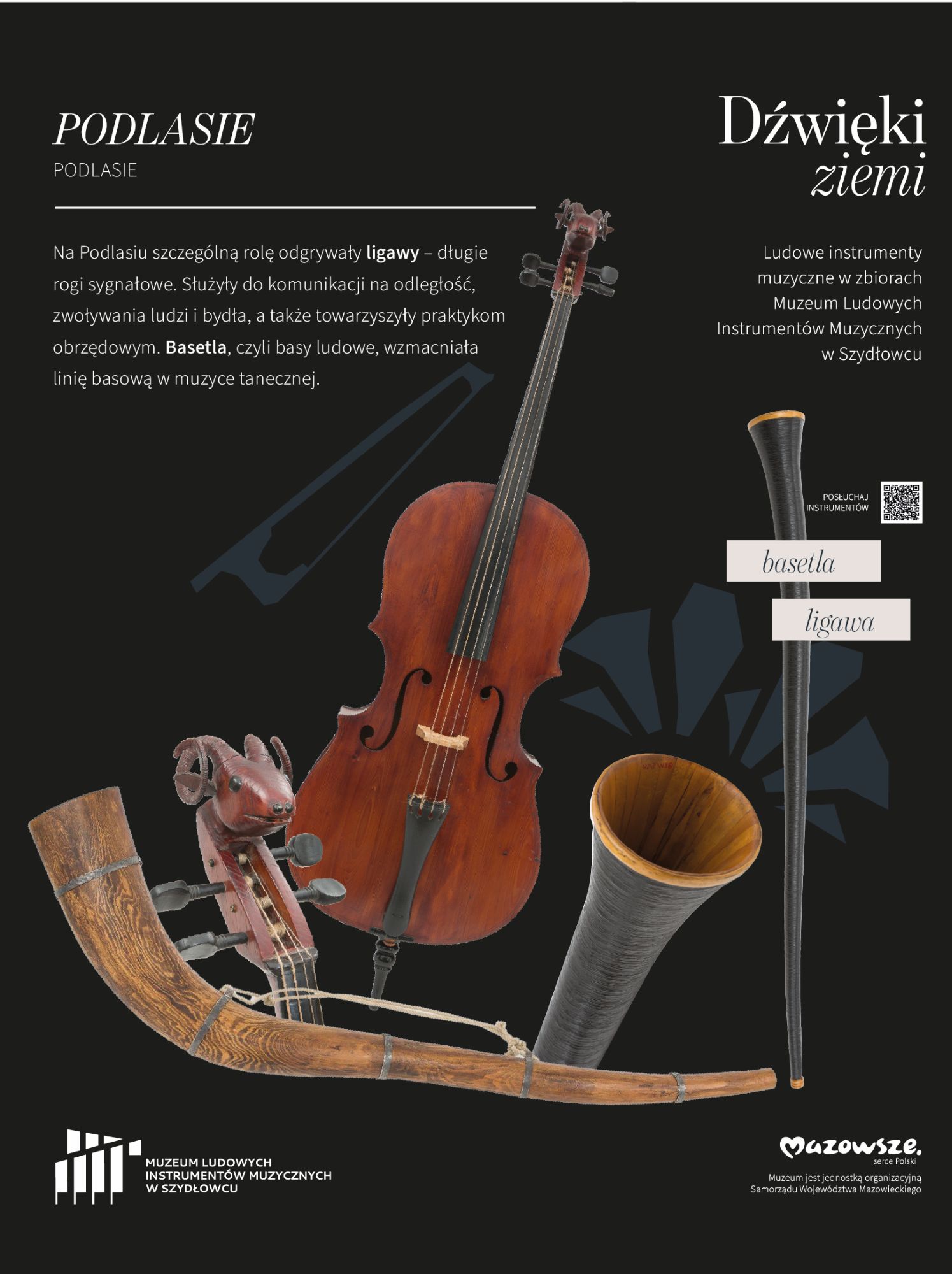Na Podlasiu szczególną rolę odgrywały ligawy – długie rogi sygnałowe. Służyły do komunikacji na odległość, zwoływania ludzi i bydła, a także towarzyszyły praktykom obrzędowym. Basetla, czyli basy ludowe, wzmacniała linię basową w muzyce tanecznej.