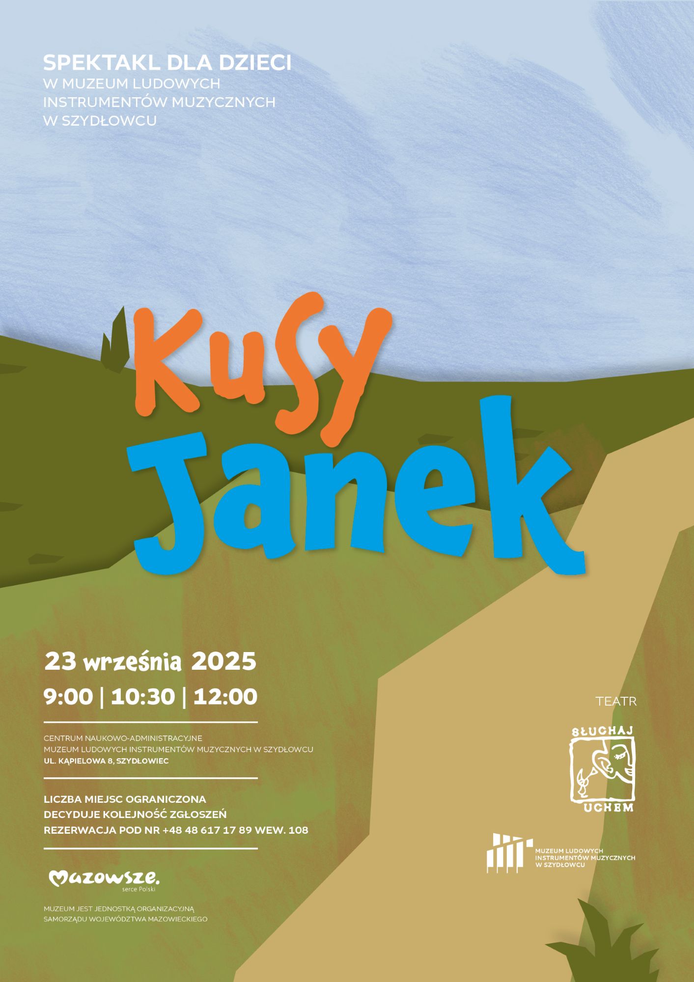 Grafika informująca o spektaklu dla dzieci "Kusy Janek", 23 września 2025 o 9:00, 10:30; 12:00.